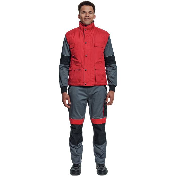 zateplená nepromokavá pánská zimní vesta; prodloužený díl na zádech; polyesterový materiál s mechanicky odolnou úpravou RipStop; 2 přední kapsy, 2 náprsní kapsy; spodní lem ke stažení na šňůrku; na bocích je polohování na zip pro regulaci obvodu vesty.
