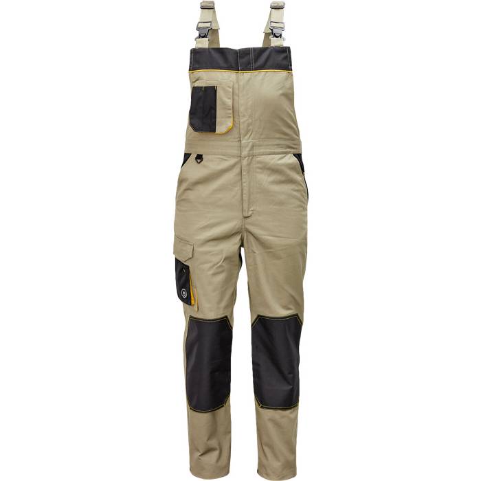 Pánské pracovní kalhoty s laclem a pružným pasem; zesílená oblast kolen materiálem Oxford 600D s možností vkládání kolenních výztuh; 5 funkčních kapes; kontrastní paspulky; nastavitelná délka nohavic.