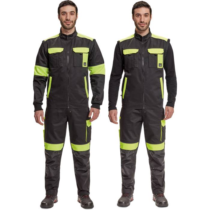 pánská pracovní bunda se zapínáním na zip; odepínatelné rukávy; 2 přední kapsy, 2 náprsní kapsy; zesílení namáhaných míst loktů a ramen; reflexní paspulky; pružné náplety manžet rukávů a elastický spodní obvod pasu.