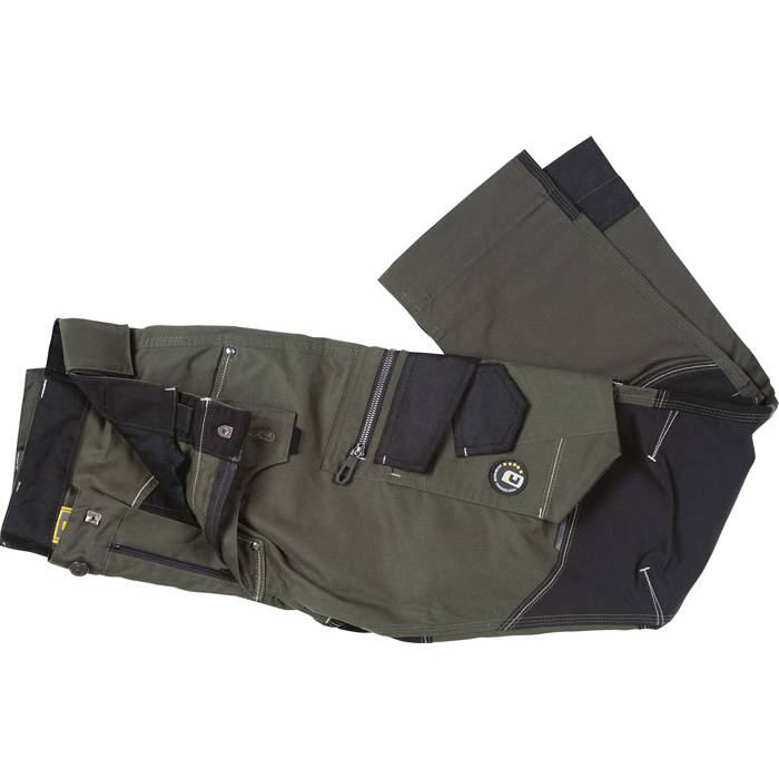 Pánské pracovní kalhoty s pružným pasem; elastický inovativní materiál TRIFIBETEX®; odolné trojité prošití nohavic a sedu; CORDURA zesílení v oblasti kolen; prostorné multifunkční přední kapsy s poutky na nářadí; reflexní prvky v barevném odstínu; nastavitelná délka nohavic.
