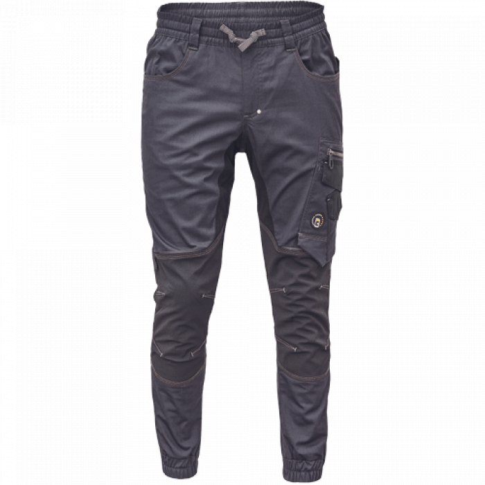 pánské pracovní kalhoty se širokým elastickým pasem; možnost stažení v pase tkanicí; 2 hluboké boční kapsy; 1 stehenní kapsa; 2 zadní kapsy; CORDURA zesílení v oblasti kolen; reflexní detaily; spodní lemy nohavic na gumu.