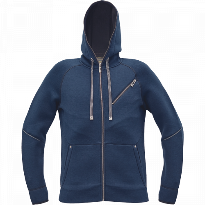 celopropínací pánská mikina s kapucí; zapínání na zip je prodlouženo až po špičku kapuce; obvod kapuce lze upravit pomocí vložené tkanice; 2 postranní kapsy, 1 náprsní kapsa na zip; reflexní detaily.