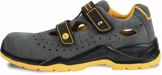 Bezpečnostní sandál v moderní šedo-žluté barevné kombinaci. Svršek obuvi je vyrobený z nubuk kůže a perforovaný po cele délce. Protiskluzová podešev odolná olejům je vyrobena z dvouhustotniho polyuretanu a zajišťuje maximální jistotu při každém kroku. Obuv je vybavena komfortní, perforovanou vnitřní stélkou, která garantuje pohodlí a cirkulaci vzduchu uvnitř boty. Absorpce energie v oblasti paty tlumí nárazy a omezuje pocit únavy nohou. Díky bezpečnostní kompozitní tužince splňuje obuv požadavky normy EN ISO 20345:2011. To znamená, že chodidla jsou chráněna před stlačením silou do 15 kN nebo pádem břemena o vaze do 20kg z výšky 1m. Chodidla jsou chráněna také ze spodu a to díky kompozitní stélce proti propichu. Obuv neobsahuje kovové součásti a je vybavena funkcí ESD. Proto je to ideální model pro vnitřní prostory a citlivé prostředí, kde je potřeba zabránit vzniku jisker z elektrostatického výboje anebo pro prostory vybavené bezpečnostním rámem. Obuv bude vhodná pro zaměstnance s vysokým nártem, protože díky velice pohodlnému zapínaní na suchy zip je možné přizpůsobit svrchní část obuvi přesně na míru a tímto dosáhnout maximálního komfortu během práce.