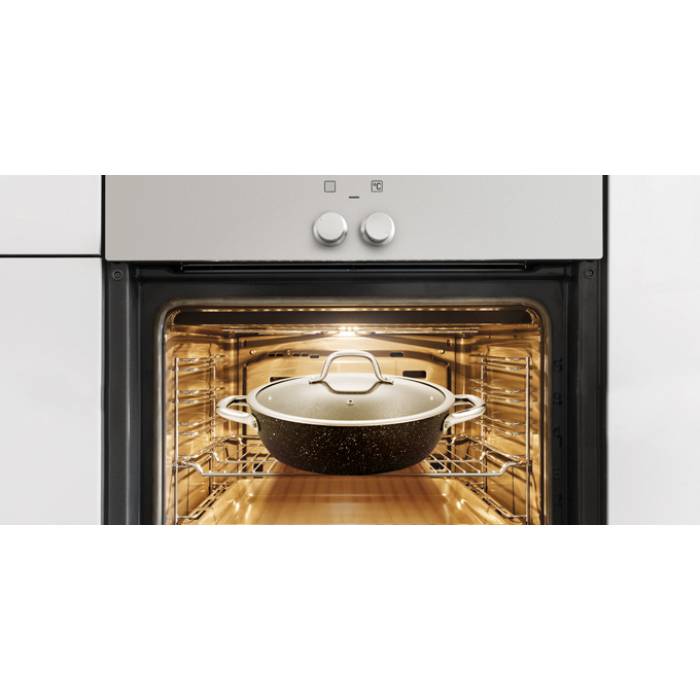 Je vybavená celonerezovým indukčním dnem. Nesmí chybět ani nerezové úchyty z prvotřídní oceli a poklice z odolného skla má otvor pro páru. Zmiňovaný antiadhezní povlak je také vně nádoby, takže se pánev snadno čistí a zajistí si svůj šarm. Nezalekne se ani kovových předmětu.